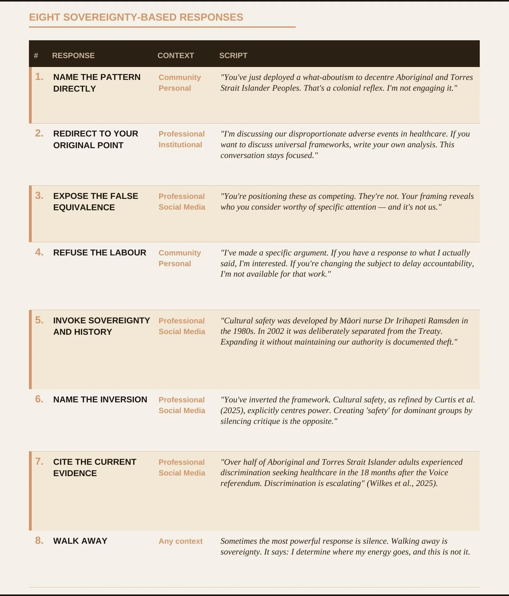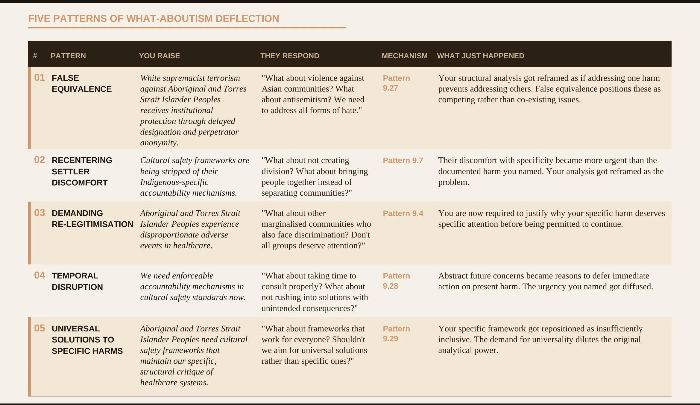 For First Nations Peoples reading this: every time you experience whataboutism deflection, you are experiencing a sovereignty violation. Someone is asserting their authority to determine whether your analysis deserves specific attention.